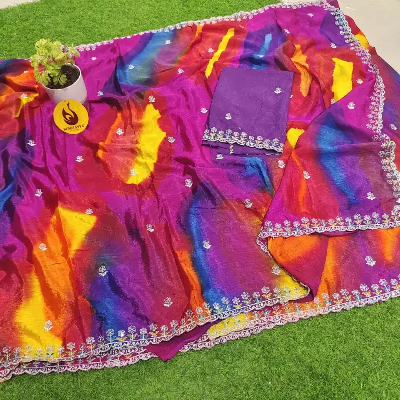 Chinon Cut Work Saree With Work Blouse